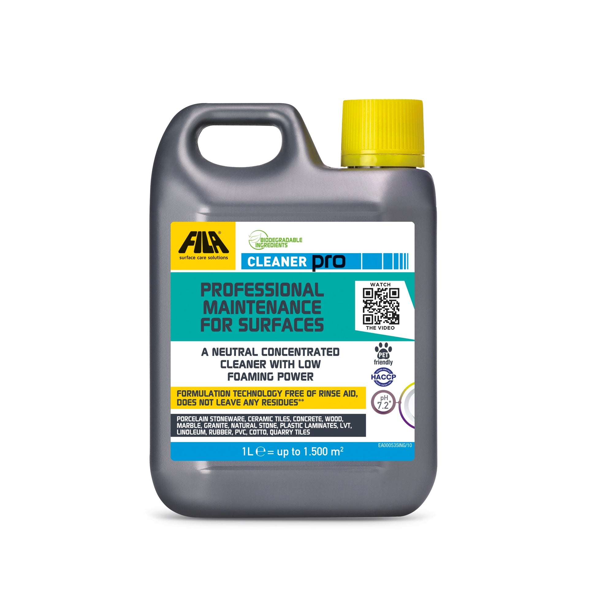 Fila CLEANER PRO gently cleans all types of surfaces without affecting treated and delicate surfaces. Available in 1l and 5l sizes.